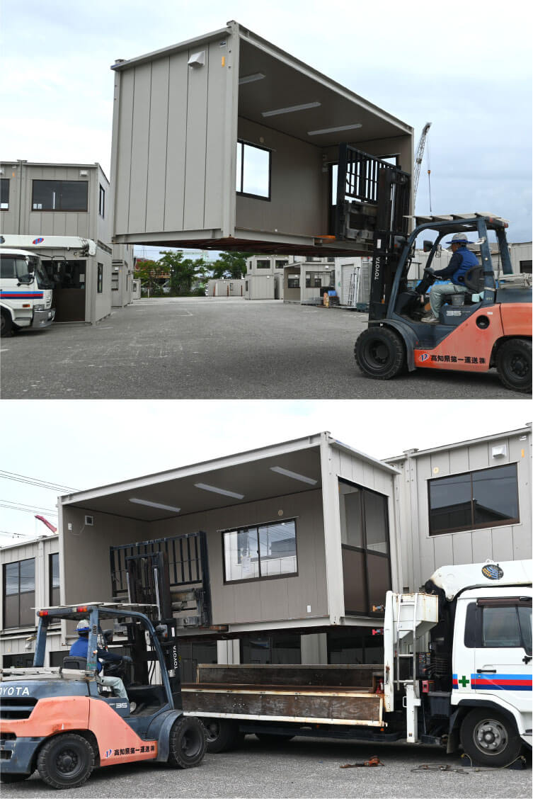 道路や橋、災害復旧現場まで、確実で安全な輸送により、プロジェクトの現場を足元から支えています。また、ハウス事業部では仮設事務所の設置やリースなど、現場環境を整えるサービスも展開しています。